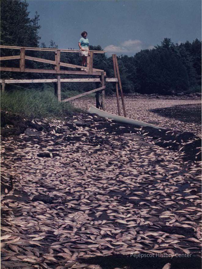 A color photographic view of Annette Porey at Orr's Cove looking at a fish kill..