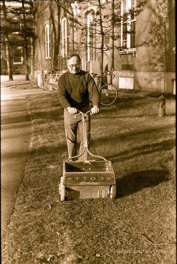 A color photographic view of Armand Bernier spreading lime at Bowdoin College.