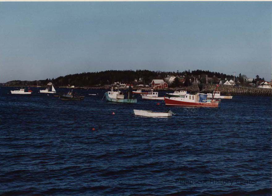 A color photographic view of Bailey's Island taken from near Cook's Lobster restaurant. The cribstone bridge can be seen in the photo..