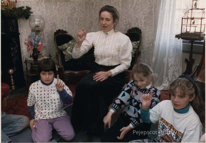 A color photographic view of Betsy Warner (Aunt Miss Betsey) with students from North School 3rd grade. This photo was published 12/20/1991.