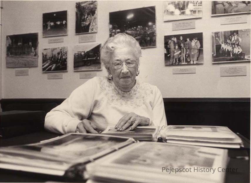 A B/W photographic view of Betty Hyde, bookkeeper at the Pejepscot Historical Society.