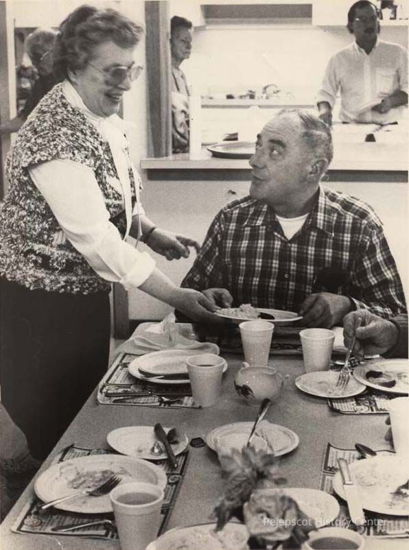A B/W photographic view of Betty Morgner serving husband Lou . This photo was published 4/2/1991.