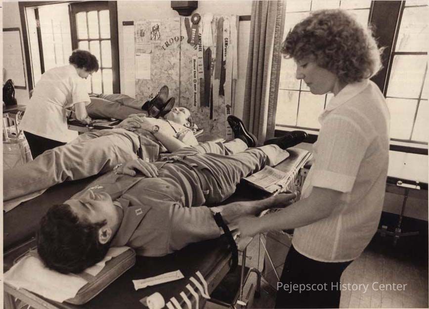 A B/W photographic view of blood donors. This photo was published 1/28/1982.