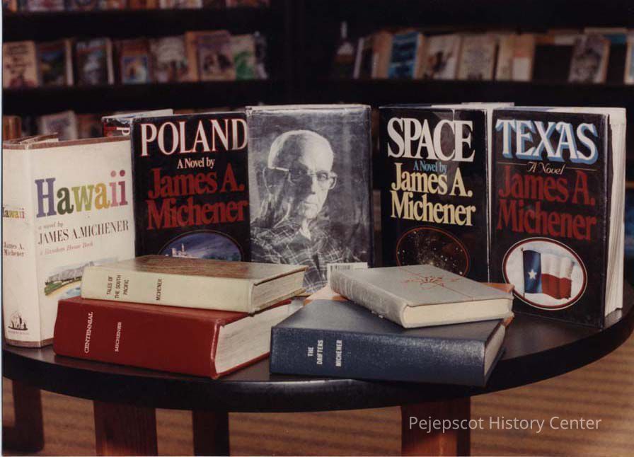 A color photographic view of books by James A. Michener in a book store.. This photo was published 2/2/1990.