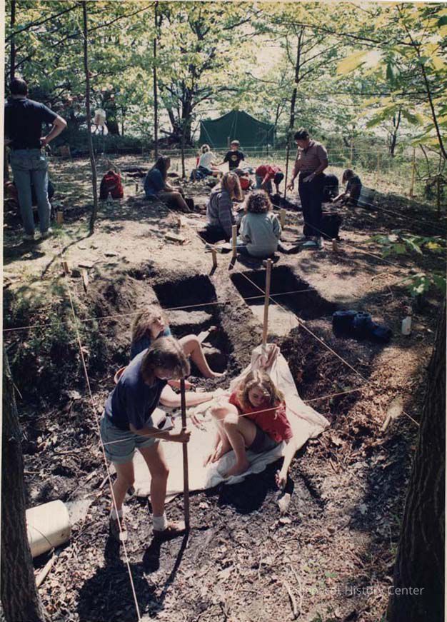 A color photographic view of Brunswick Jr. High School students at Maquoit Bay on an archeology dig. They are (standing) Melissa Ladd, Liz Norman (right) and Ingrid Prwl (back left).