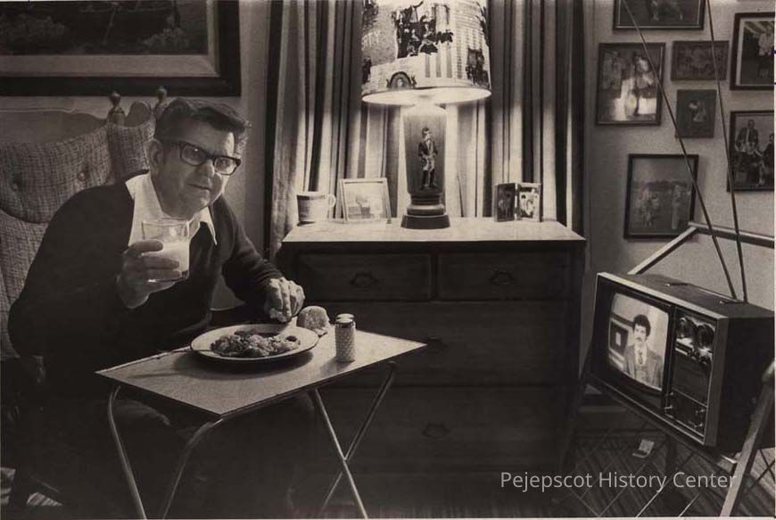 A B/W photographic view of Campbell Niven dinning in style with the 6 o'clock news. This photo was published 11/9/1981.