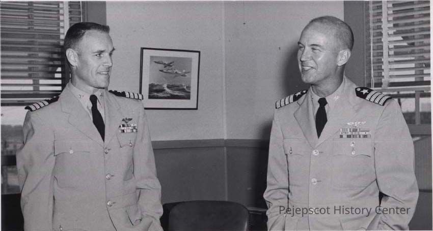 A B/W photographic view of and Capt. Humphrey L. Tallman (left) and Capt. William L. Pack (right), United States Navy, at the Brunswick Naval Air Station.