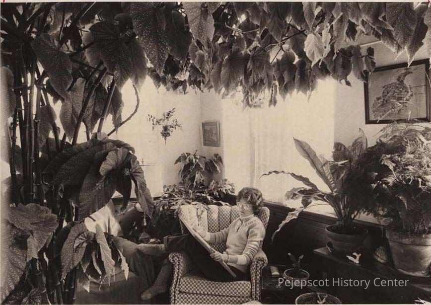 A B/W photographic view of Cherie Hunter Day in the plant room of her house.