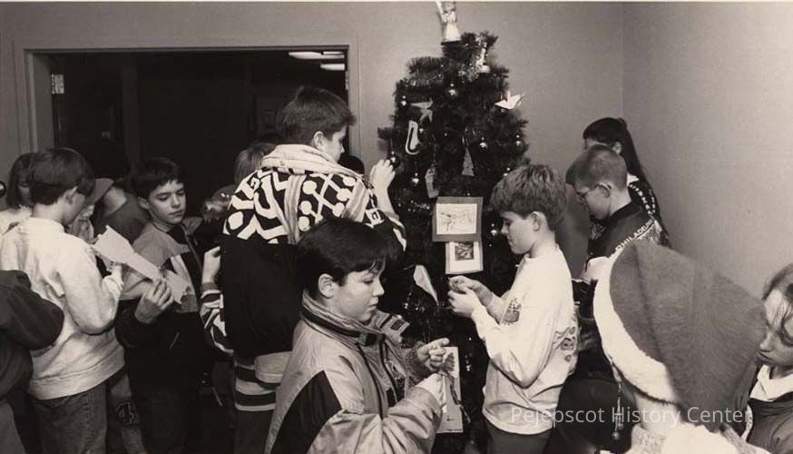 A B/W photographic view of children at a Christmas party at the Midcoast Hospital.