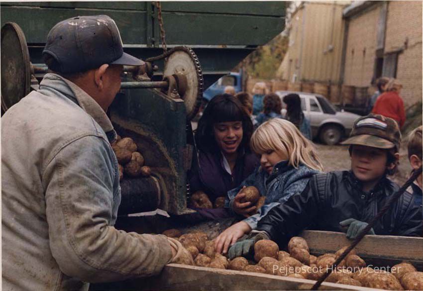 A color photographic view of children looking at potatoes coming off a conveyor belt. This photo was published 10/11/1988.