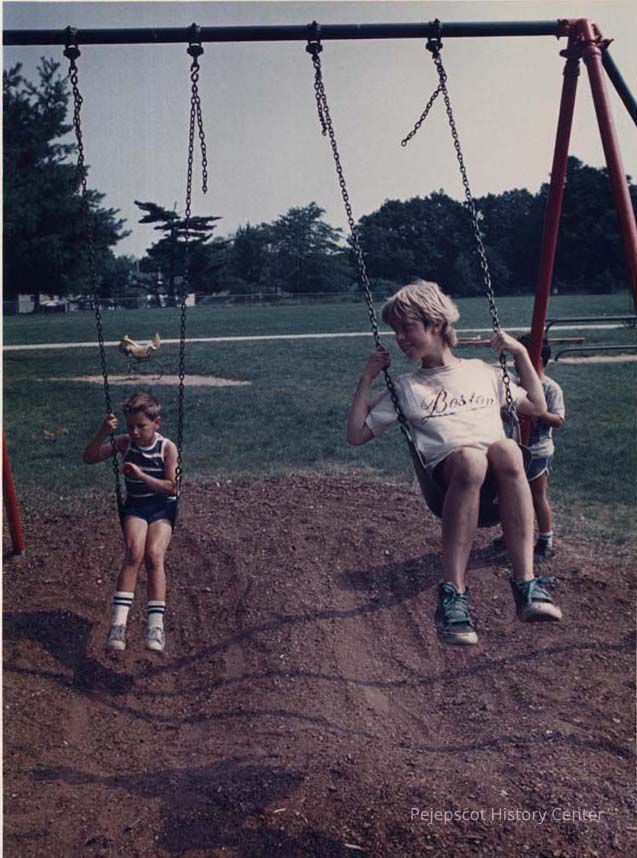 A color photographic view of children playing on a swing set. This photo was published 8/9/1988.
