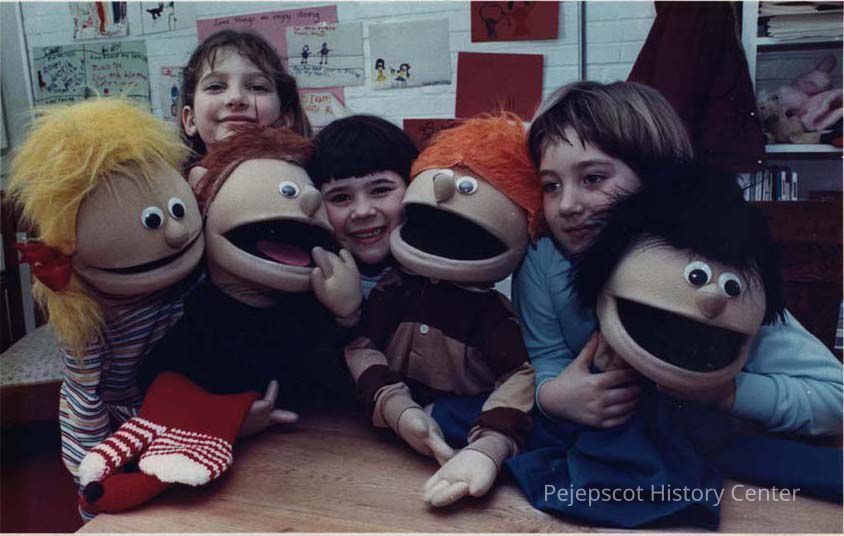 A color photographic view of children playing with muppet dolls. This photo was published 3/27/1990.