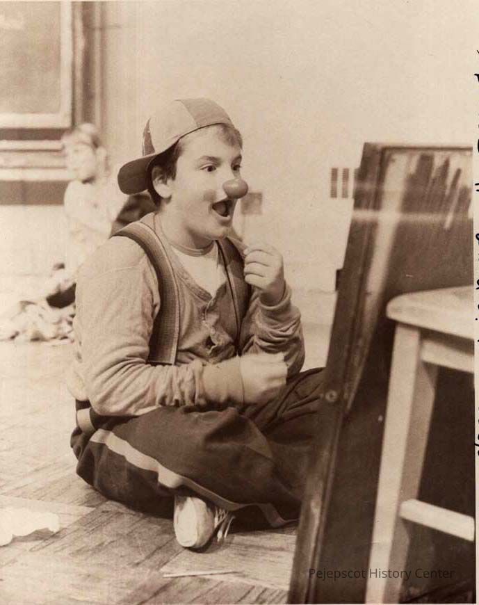 A B/W photographic view of Chris Reeve age 7, of Freeport tries on a new face during clown class.