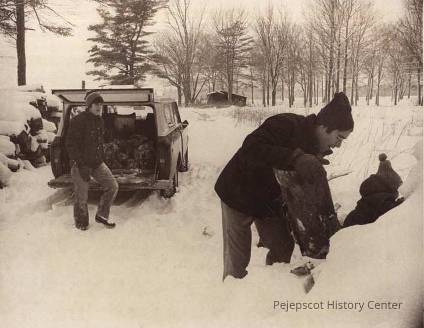 A B/W photographic view of Christopher Livesay and family moving wood into the house..