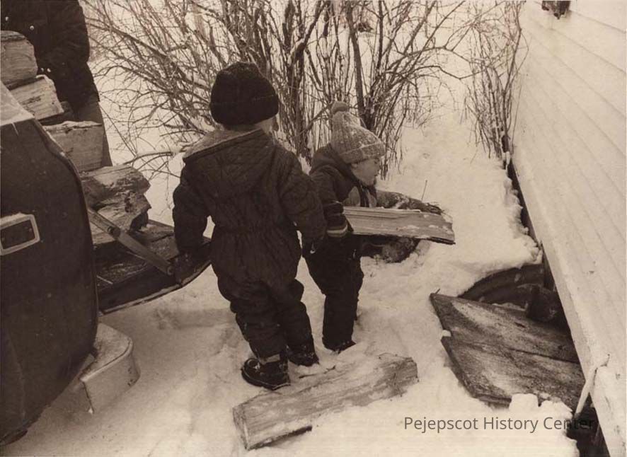 A B/W photographic view of Christopher Livesay family putting wood into the house.