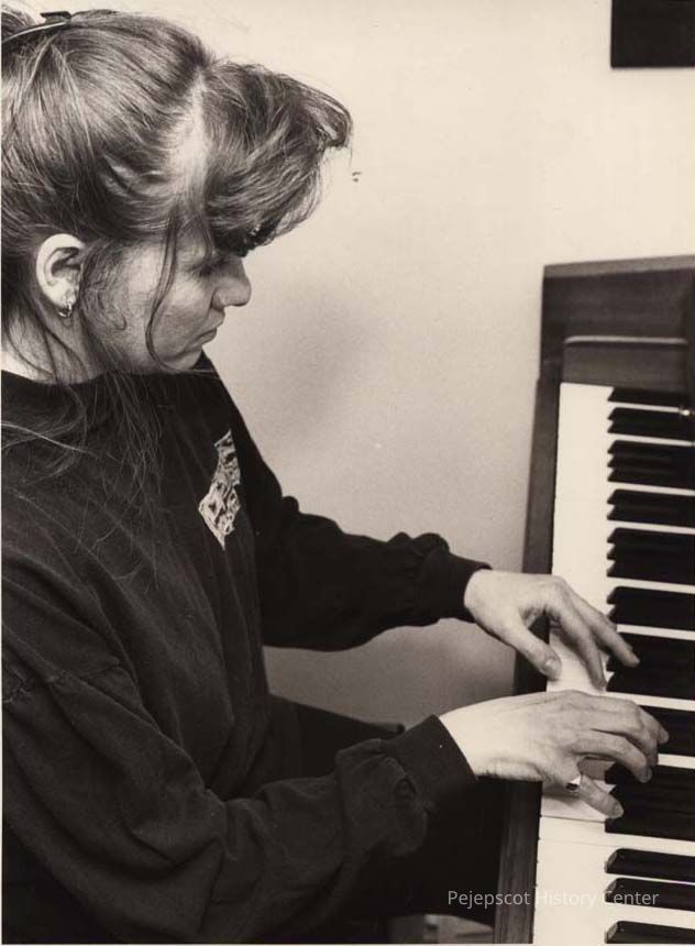 A B/W photographic view of Cindy Adams playing the piano. This photo was published 4/24/1992.