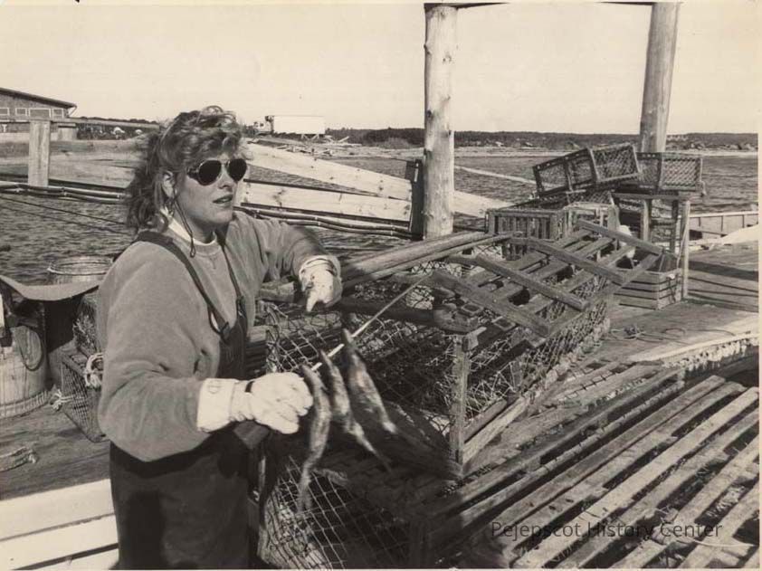 A B/W photographic view of Clare Murphy Stack, baiting a lobster trap. This photo was published 10/9/1991.