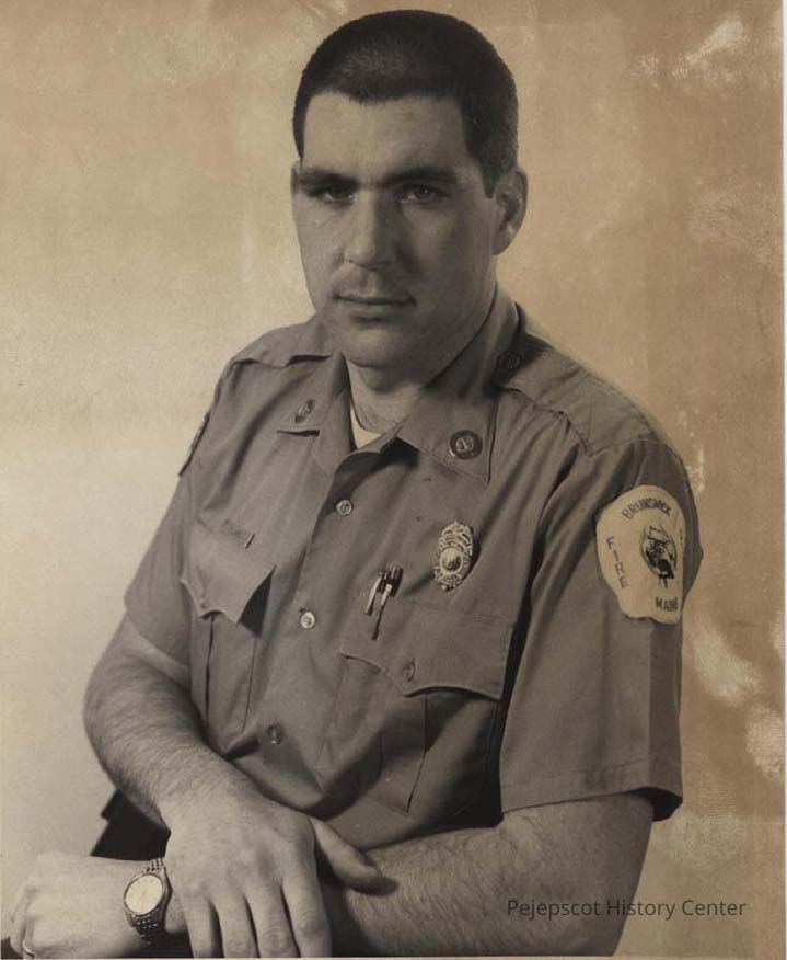 A B/W photographic view of Clark G. Labbe who was promoted to Captain in the Brunswick Fire Department.. This photo was published 5/10/1984.