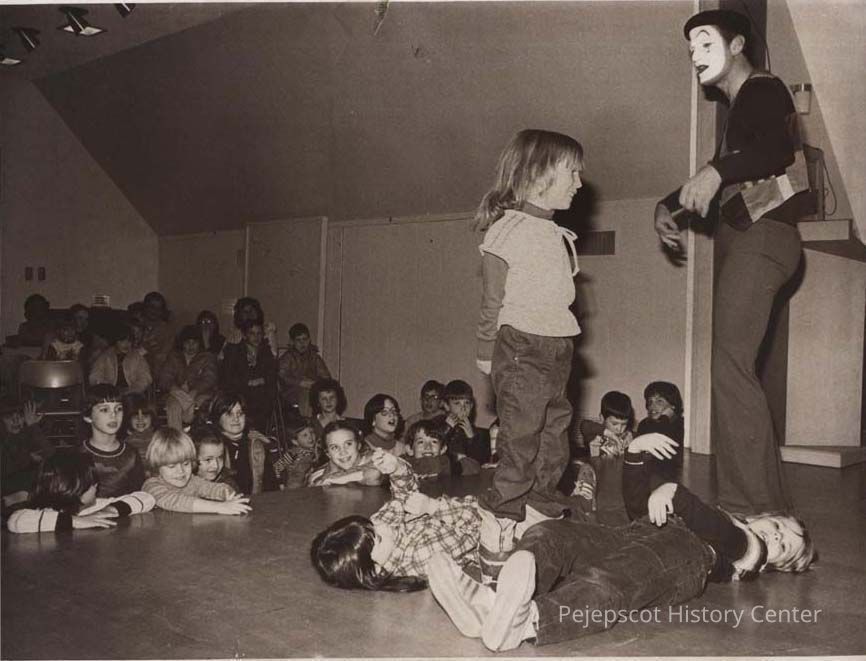 A B/W photographic view of Clown Al and Tiffany. He is performing at the Patten Library in Bath. This photo was published 1/28/1980.
