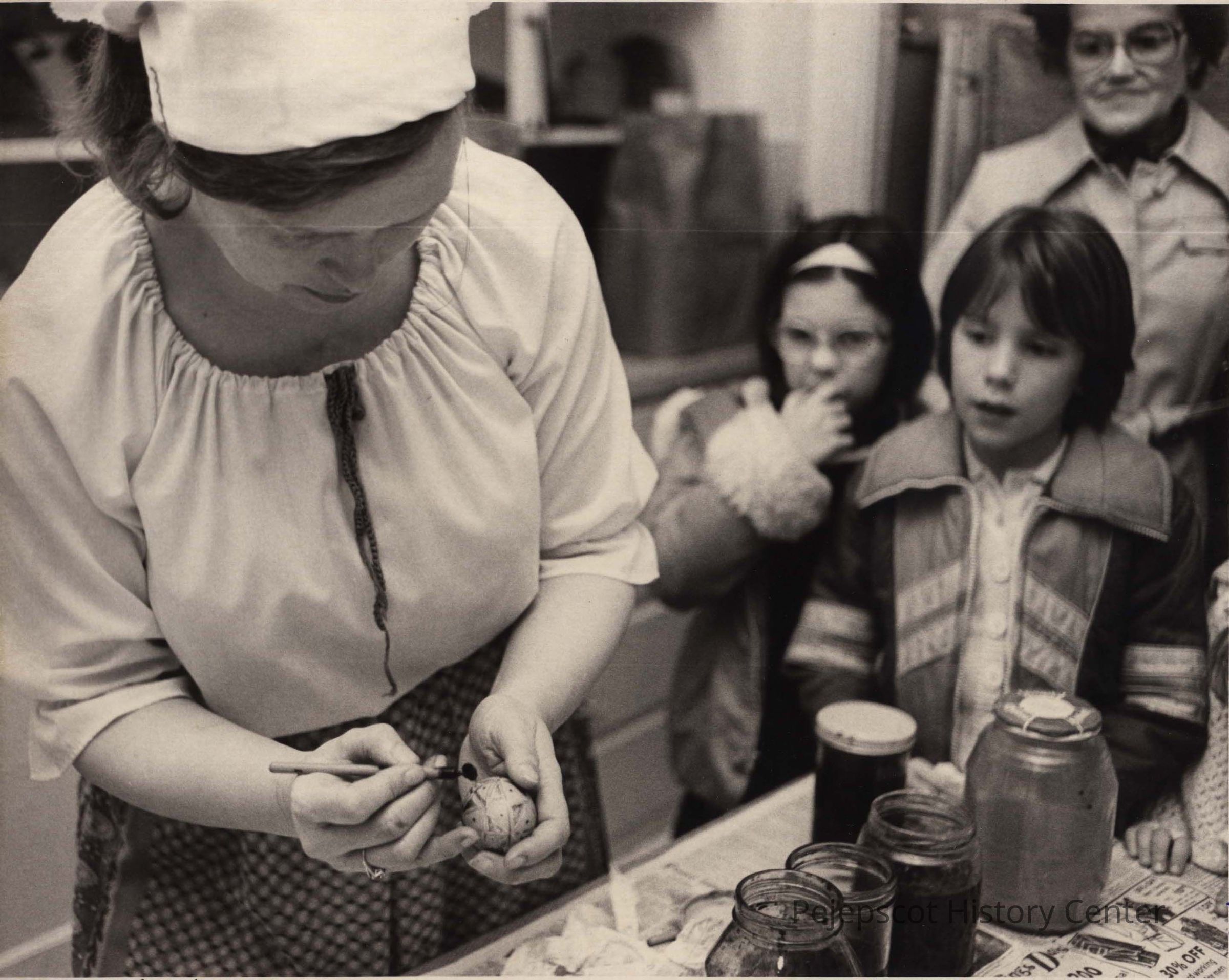 A B/W photographic view of coloring Easter eggs. This photo was published 4/13/1981.