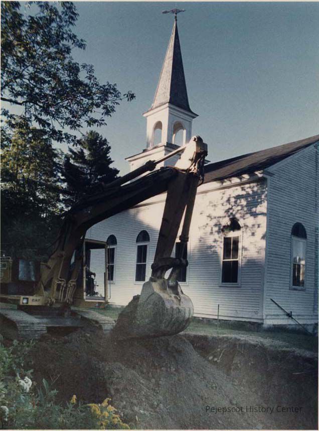 A color photographic view of construction work going on beside a church.. This photo was published 8/26/1988.