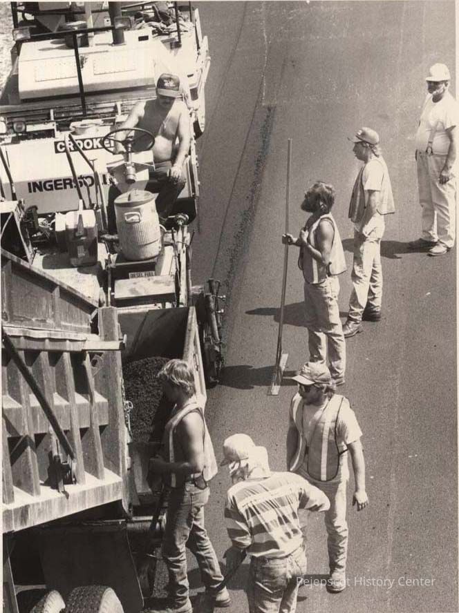 A B/W photographic view of Crookers Paving crew working on Route 1 southbound.