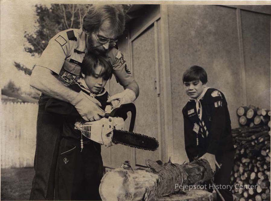 A B/W photographic view of scoutmaster Dan Oliver shows Todd Sherman, how to use a chain saw. This photo was published 11/2/1981