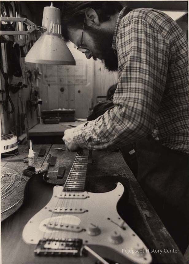 A B/W photographic view of Dana Bourgois working on a Fender Stratocaster. This photo was published 6/11/1984.