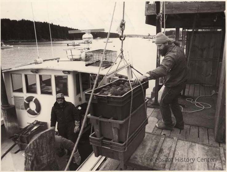 A B/W photographic view of Dave Suffin unloading sea urchins. This photo was published 1/14/1992.