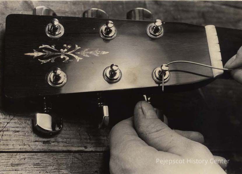 A photo view of David Bourgois stringing a guitar. 6/11/1984.