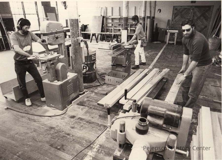 A B/W photographic view of David Pollock, sculptor and teacher, Paul Cipriani, teacher and Peter Milholland owner. The photo was taken at Benchworks at Fort Andross.