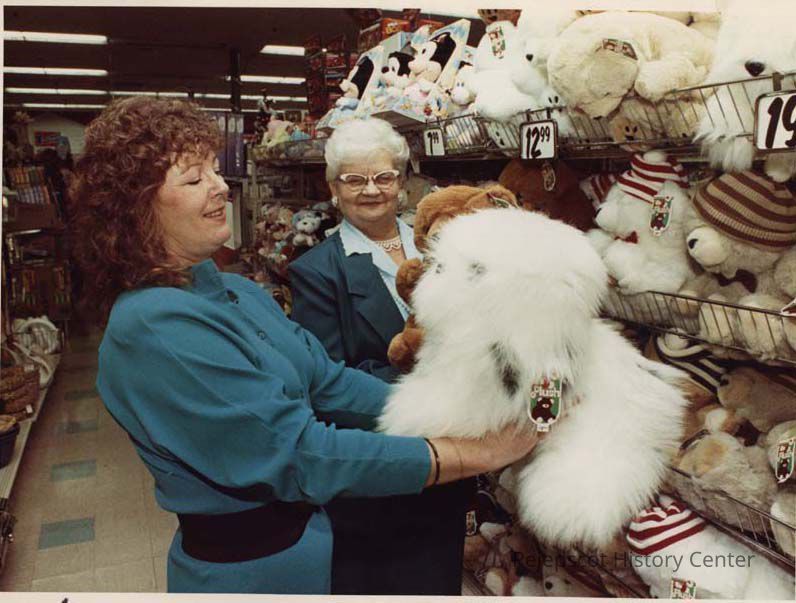 A color photographic view of Dawn Bowgee & Cecil Belanger selecting toys for the Santa fund. This photo was published 11/27/1989.