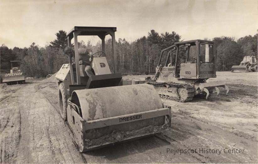 A B/W photographic view of Dean Brown (Bowdoin Maine) an employee of Hubbard Construction Co. of Brunswick, Maine, smooths the covering of the old landfill..