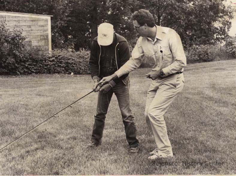 A B/W photographic view of John Kluesing from L. L. Bean instructing Dick Darcey from Orr's Island in fly fishing at the N. E. Salt Water Fly Fishing School at Harpswell Inn at Lookout Point.