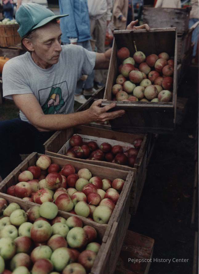 A color photographic view of Dick Keogh of Buckfield selling apples at the Brunswick Farmers market. This photo was published 10/02/1989.