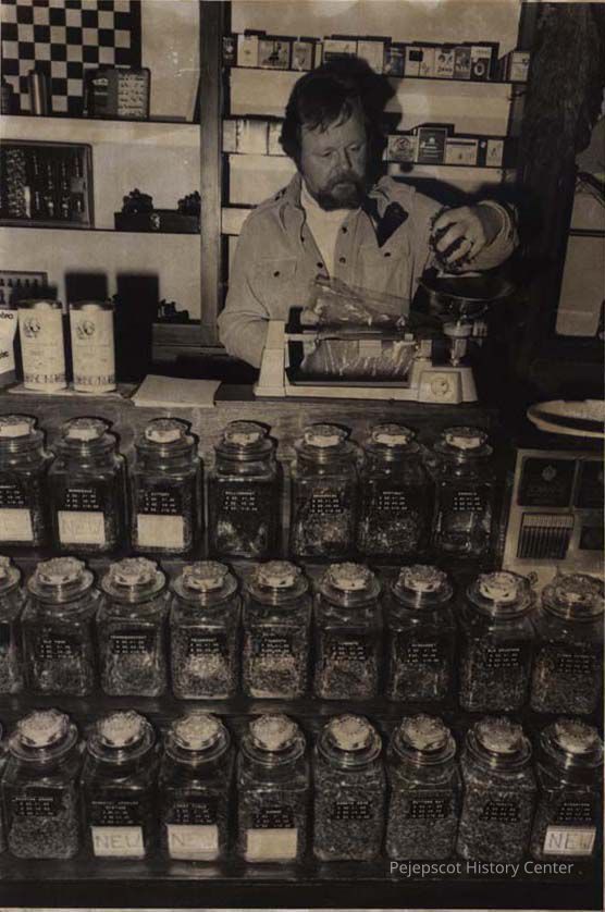 A B/W photographic view of Dick Leach owner of the "Silent Man" a tobacco shop in the Tontine Mall. This photo was published 3/18/1980 and 2/18/1981.
