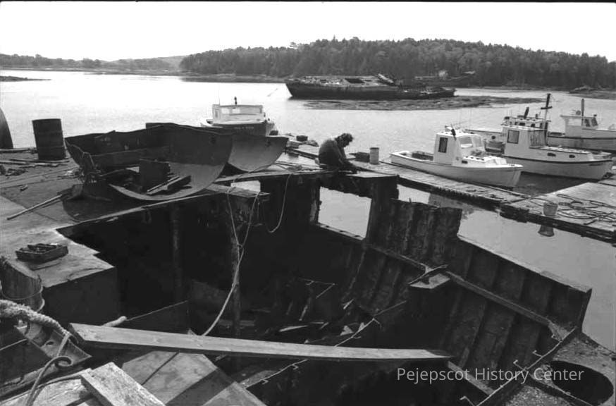 A B/W photographic view of dismantling a boat at Cundy's Harbor.