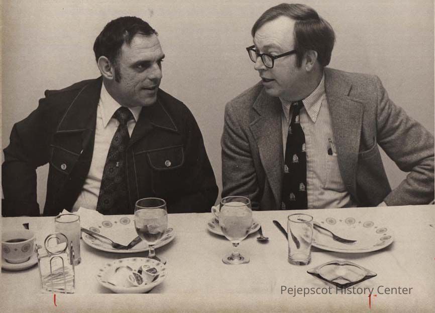 A B/W photographic view of Dominique Vermette Brunswick Police Department Chief with local car dealer Frank Goodwin. This photo was published 4/25/1979.