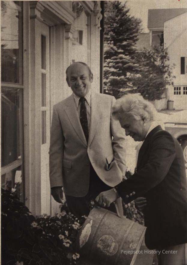A B/W photographic view of Donald J. McKissock & Margaret Charron in front of the Chamber of Commerce. This photo was published 9/17/1980