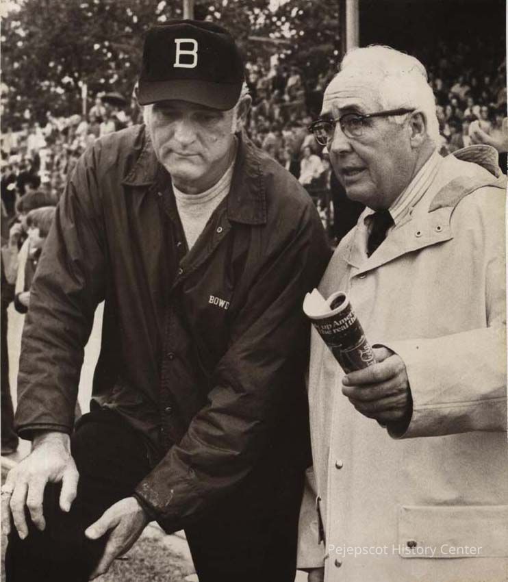 A B/W photographic view of Bowdoin physician Dr. Daniel Hanley and trainer Mike Linkovich. 10/6/1975. This photo was published 10/6/1975.