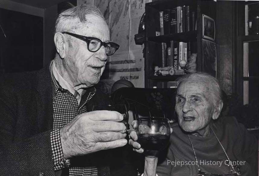 A B/W photographic view of Dr. & Mrs.(Harriet) Donald Macomber drinking a toast on their 90th birthday. This photo was published 2/11/1979.