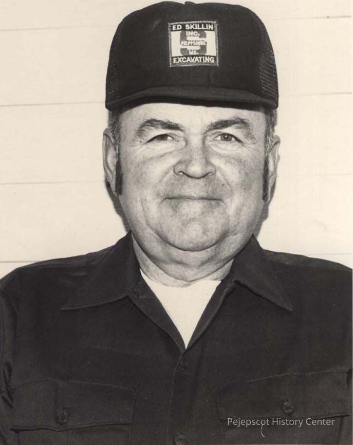 A B/W photographic view of Edward M. Skillins. He is wering a hat which says, " Ed Skillins Inc., Excavating". This photo was published 3/14/1991.