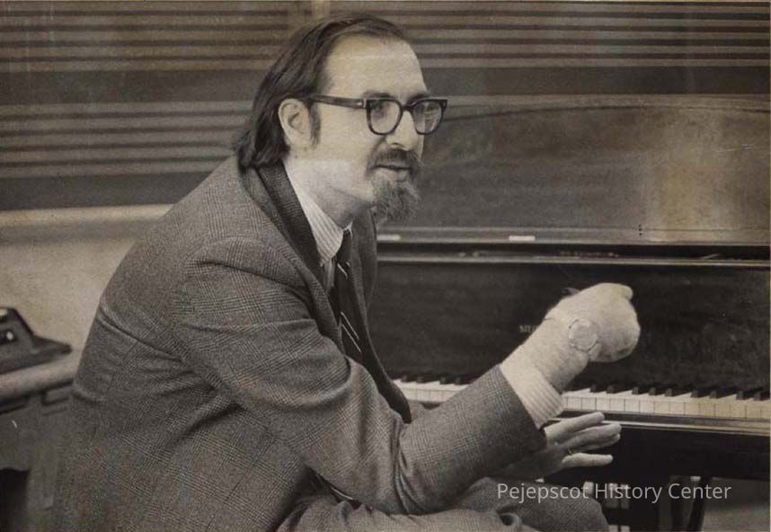 A B/W photographic view of Elliott Schwartz who presented a piano concert at Bowdoin. This photo was published 5/14/1974.