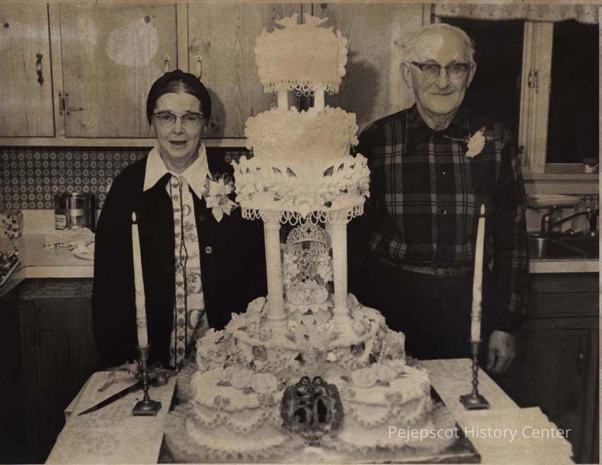A B/W photographic view of Elsie & Harold Wallace celebrating their 50th wedding anniversary. This photo was published 12/24/1975.