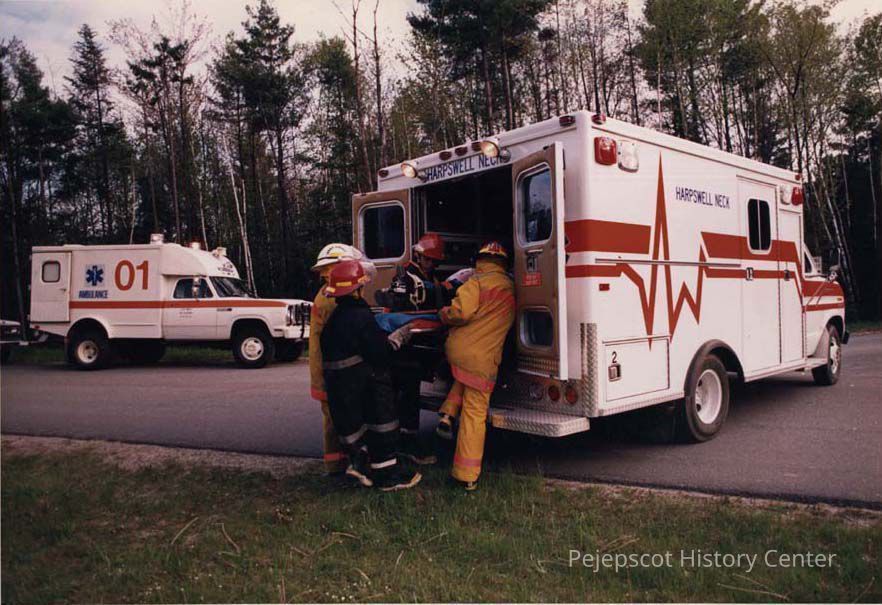 A color photographic view of Harpswell Neck EMT's at work. This photo was published 6/29/1990.