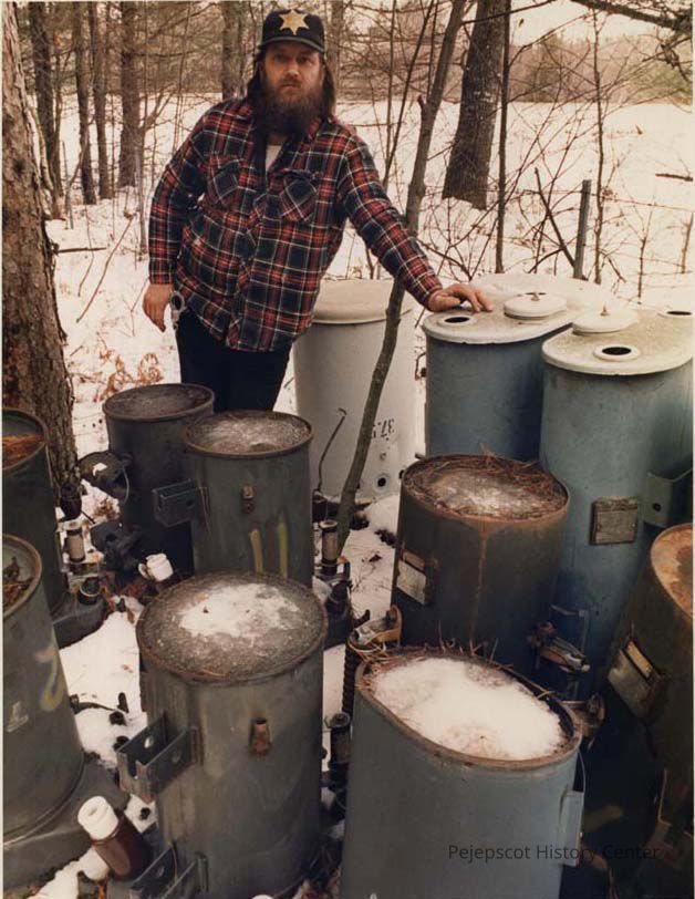 A color photographic view of Ernest S. Jewett III standing amongst some discarded electrical transformers. This photo was published 2/17/1989.