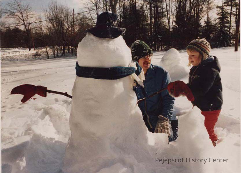 A photo view of father and daughter building a snowman. 1/26/1987.