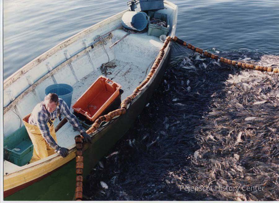 A color photographic view of fisherman Kenneth Wright pulling in a net full of Pogies (used for baiting lobster traps).