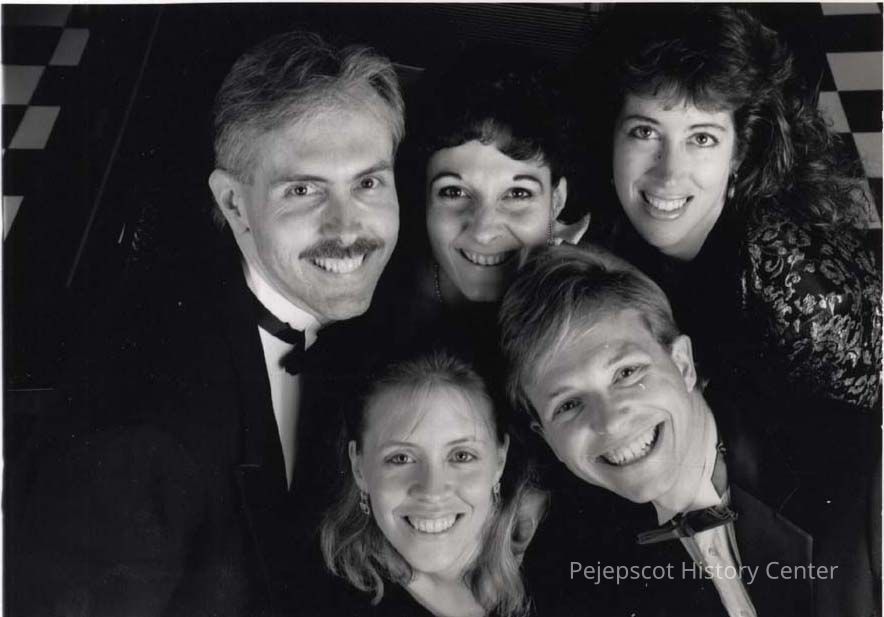 A B/W photographic view of (l to r) Steve Filieo, Joyce Moulton, Bethann Renaud, Brian P. Allen and Lynne McGhee.