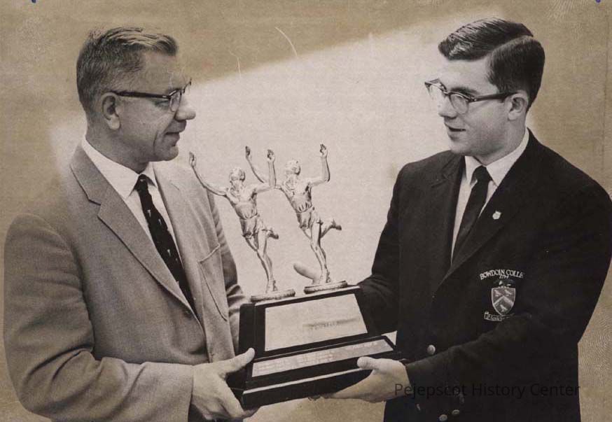 A B/W photographic view of Frank Sabasteanski (left) receiving the Claff Trophy.